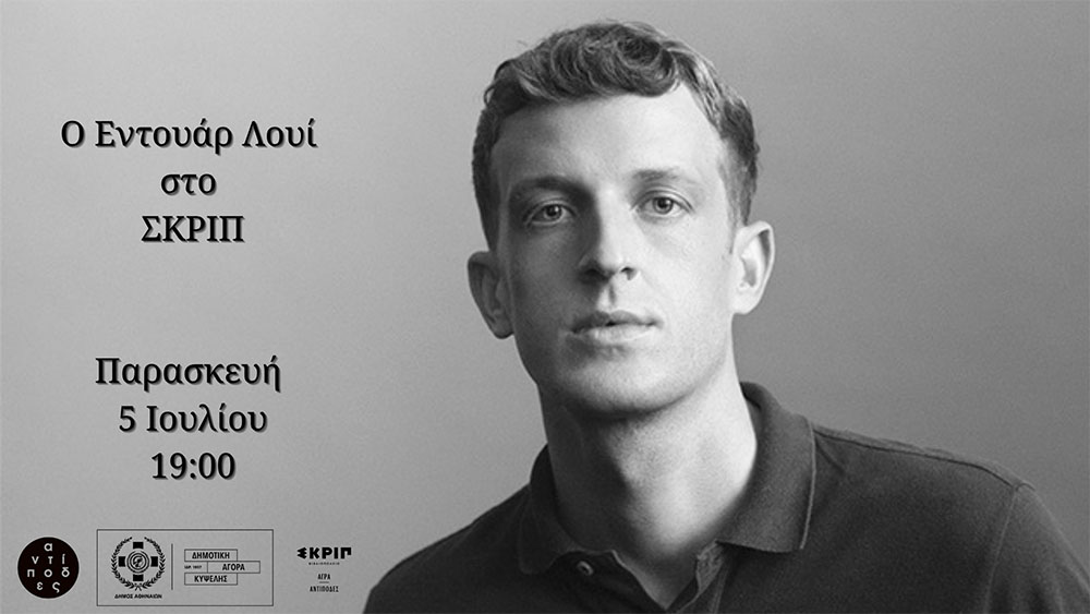 Οι εκδόσεις Αντίποδες και το βιβλιοπωλείο ΣΚΡΙΠ μας καλούν να γνωρίσουμε από κοντά τον Γάλλο συγγραφέα Εντουάρ Λουί στη Δημοτική Αγορά Κυψέλης. Ο συγγραφέας θα συζητήσει με τους παρευρισκόμενους και τις παρευρισκόμενες, θα υπογράψει τα βιβλία του και θα δεχτεί ερωτήσεις.