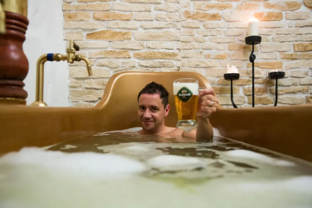 Χαλάρωση σε μπανιέρα μπύρας: Μπάνιο σε ζεστό νερό με μπύρα, το οποίο θεωρείται ότι βοηθά στη χαλάρωση των μυών και την ενυδάτωση του δέρματος. Η θερμοκρασία διατηρείται σταθερή (περίπου στους 35-37 βαθμούς Κελσίου), ενώ η μπύρα καθ’ όλη τη διάρκεια (από 20 έως 30 λεπτά) της συνεδρίας «αφρίζει», απελευθερώνοντας βιταμίνες, υδατάνθρακες και πρωτεΐνες. Τα λουτρά μπύρας είναι ιδανικά τόσο για ζευγάρια όσο και για μοναχικούς λάτρεις της μπύρας.