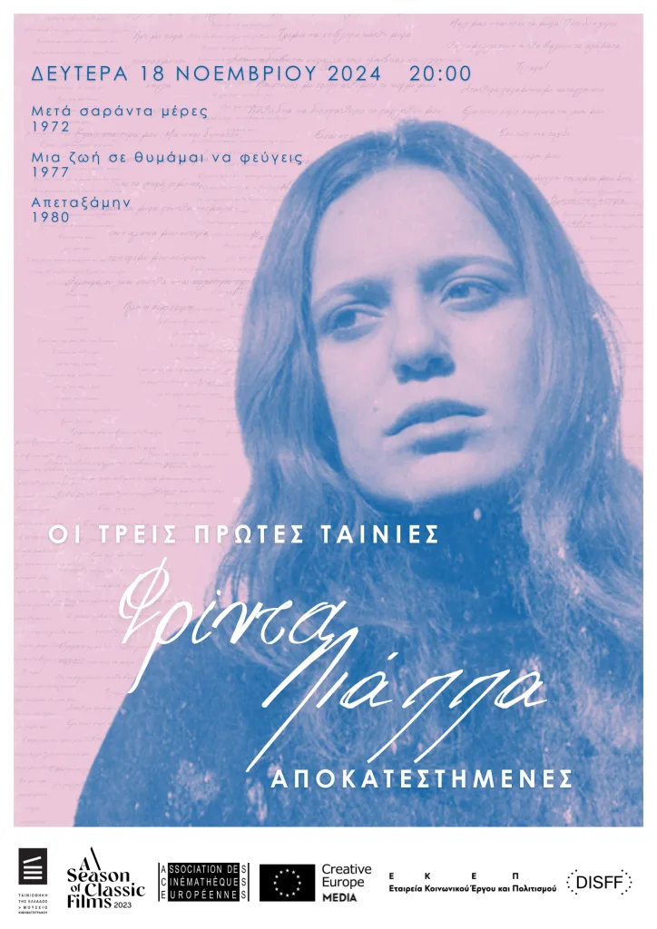 Η Ταινιοθήκη της Ελλάδος και ο σκηνοθέτης Κυριάκος Αγγελάκος, με αφορμή την συμπλήρωση τριάντα χρόνων από το θάνατο της σημαντικής δημιουργού, παρουσιάζουν σε ψηφιακά αποκατεστημένες κόπιες τις τρεις πρώτες ταινίες της Φρίντας Λιάππα: Μετά σαράντα μέρες (1972), Μια ζωή σε θυμάμαι να φεύγεις (1977) και Απεταξάμην (1980). Η εκδήλωση θα πραγματοποιηθεί τη Δευτέρα 18/11 στις 20.00, στην Ταινιοθήκη της Ελλάδος με ελεύθερη είσοδο.