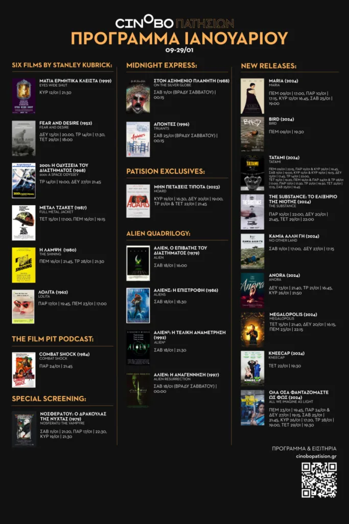 Στα highlights του μήνα, το Alien Quadrilogy στις 18 Ιανουαρίου θα χαρίσει επικές στιγμές στους λάτρεις της επιστημονικής φαντασίας, οι οποίοι θα απολαύσουν έναν μαραθώνιο αφιερωμένο στις τέσσερις πρώτες ταινίες του Alien franchise. Ακόμη, με αφορμή την κυκλοφορία της νέας ταινίας Nosferatu του Robert Eggers, το Cinobo Πατησίων γυρνά στις απαρχές του μύθου με την προβολή της κλασικής δημιουργίας του Werner Herzog, Νοσφεράτου: Ο Δράκουλας της Νύχτας. Τέλος, το Film Pit Podcast παρουσιάζει το σκοτεινό αριστούργημα του Buddy Giovinazzo, Combat Shock, μια συγκλονιστική εξερεύνηση της μεταπολεμικής απόγνωσης και της ανθρώπινης ψυχής.