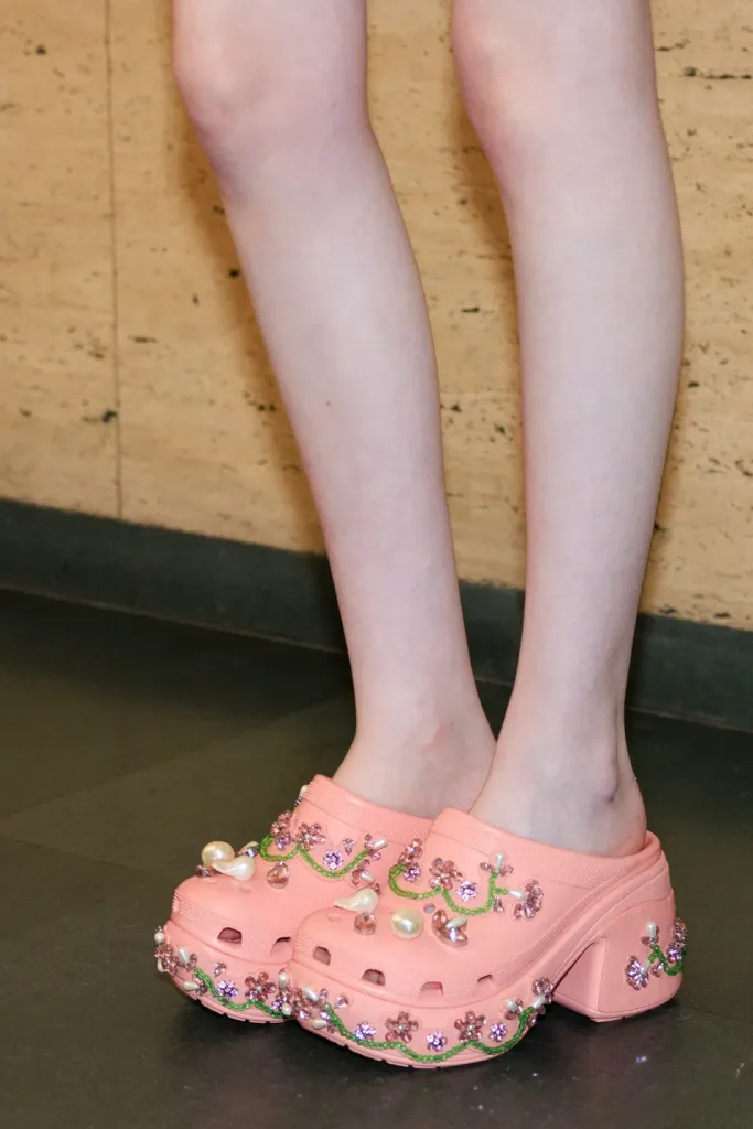 Η Simone Rocha μας έχει ήδη συνηθίσει να αναδεικνύουμε την πιο πολύτιμη πλευρά των περίπλοκων Crocs μέσα από σχέδια τύπου mule, με γόβες ή flat, που ενσωματώνουν floral λεπτομέρειες από χάντρες, στρας και πέρλες. Ο Giambattista Valli τα χρησιμοποιεί επίσης το 2025 για να δώσει μια ακόμη πιο λεπτή πινελιά στις σατέν μπαλαρίνες του, με ένα αραβικό ύφασμα που περιλαμβάνει κρύσταλλα και μαργαριτάρια, πέρα από τις ιογενείς ξύλινες σφήνες του, η Chloé είναι μια άλλη μάρκα που φέρνει με τη σειρά της τη λάμψη στα flat παπούτσια της προσθέτοντας μικρές λεπτομέρειες για θαυμασμό σε αυτές.