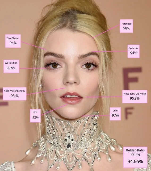 Ο Dr Julian De Silva, που διευθύνει το Κέντρο Προηγμένης Αισθητικής και Πλαστικής Χειρουργικής Προσώπου στο Λονδίνο, είπε: «Η Anya Taylor-Joy είχε την υψηλότερη συνολική ένδειξη για την τοποθέτηση των ματιών της, με βαθμολογία 98,9%, που είναι μόνο 1,1 ανά σεντ μακριά από το να είναι το τέλειο σχήμα. Η Anya είχε, επίσης, την υψηλότερη βαθμολογία για τα φρύδια της και ήταν κοντά στην κορυφή σχεδόν σε κάθε κατηγορία εκτός από τα χείλη της».