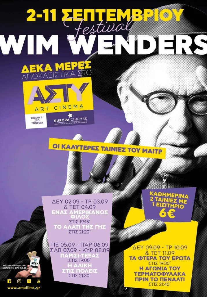 Μετά το ιστορικό Ταινιόραμα στις αρχές του καλοκαιριού, ο κινηματογράφος Άστυ επανέρχεται με ένα αφιέρωμα στον πολυβραβευμένο Γερμανό σκηνοθέτη της περιπλάνησης, όπως συνηθίζεται να περιγράφεται λόγω των road movies που έχει σκηνοθετήσει. Από 2 έως 11 Σεπτεμβρίου θα προβληθούν 6 ταινίες του Βιμ Βέντερς, σταθμός για τον παγκόσμιο κινηματογράφο.