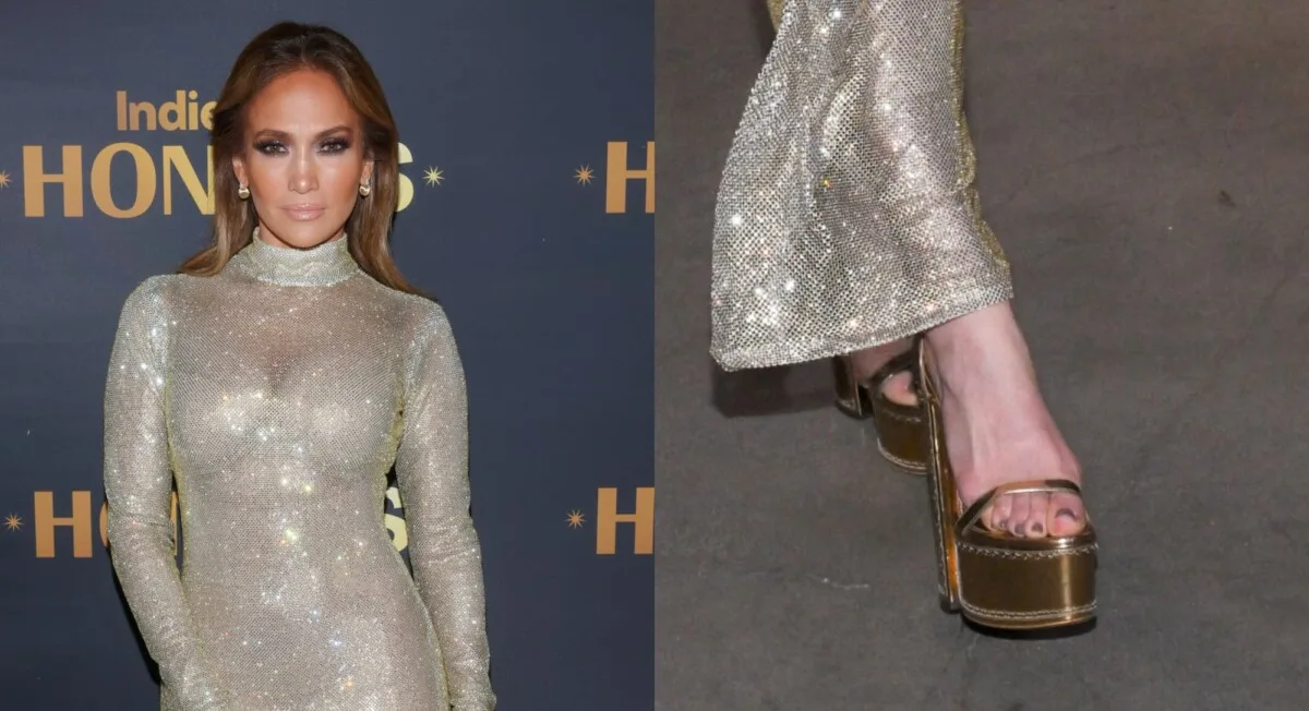 Ας ξεκινήσουμε όμως με το look της. Για την περίσταση, η Jennifer Lopez επέλεξε ένα γυαλιστερό διχτυωτό φόρεμα με διαφάνειες σε χρυσό σαμπάνιας. Μια πολύ εμπνευσμένη εμφάνιση για τις ερχόμενες γιορτές. Ωστόσο, σχεδόν ανεπαίσθητα κάτω από την εμφάνισή της, καθώς η Jennifer Lopez περπατούσε, μας έδειξε τα τέλεια παπούτσια για να συνδυάσουμε μια ξεχωριστή χριστουγεννιάτικη εμφάνιση: μια τέλεια βασική, XXL χρυσή πλατφόρμα. Αυτά τα παπούτσια δεν είναι μόνο τέλεια για την παραμονή των Χριστουγέννων και της Πρωτοχρονιάς, αλλά μπορούν επίσης να επαναχρησιμοποιηθούν σε guest look, καθιστώντας τα μια καλή εορταστική προσθήκη σε κάθε γκαρνταρόμπα.