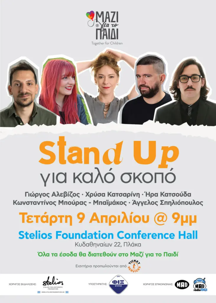 Το «Μαζί για το Παιδί» διοργανώνει μια βραδιά γέλιου και προσφοράς. Πέντε stand up κωμικοί, οι Γιώργος Αλεβίζος, Χρύσα Κατσαρίνη, Ήρα Κατσούδα, Κωνσταντίνος Μπούρας-Μπαϊμάκος και Άγγελος Σπηλιόπουλος ενώνουν τις δυνάμεις τους στη σκηνή, προσφέροντας άφθονο γέλιο με έναν κοινό στόχο: τη στήριξη των παιδιών που το έχουν ανάγκη.