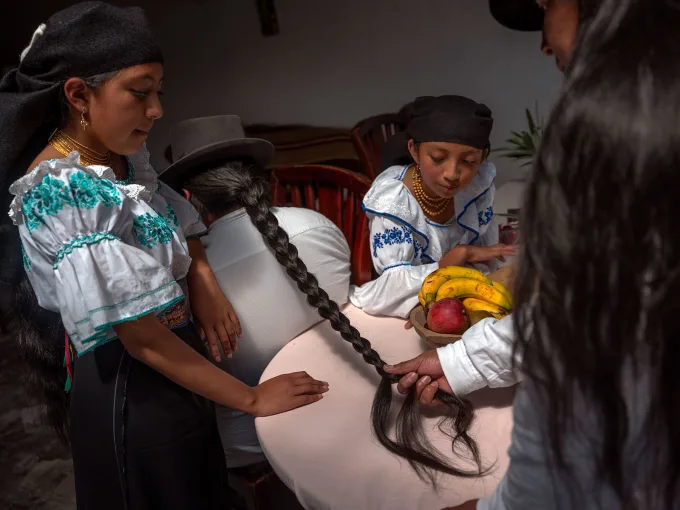 Σε μια εικόνα από το “La Resistencia”, αδελφές, ντυμένες με παραδοσιακές λευκές μπλούζες, συγκεντρώνονται σε ένα τραπέζι καθώς ο πατέρας τους πλέκει τα μαλλιά του αδερφού τους. Werning είπε ότι όταν ο πατέρας, RUMINawi Cachimuel, ήταν μικρός, η οικογένειά του έκοψε τις πλεξούδες του για να μην αντιμετωπίσει διακρίσεις στο σχολείο. Αλλά τώρα, τονίζει τη σημασία της διατήρησης των παραδόσεων Kichwa στα παιδιά του, από τα ρούχα και τη μουσική τους μέχρι τα μαλλιά τους, εξήγησε. «Παλέψαμε σκληρά για τις πλεξούδες μας· ήταν ένας μακρύς αγώνας για να δείξουμε περήφανα τις πλεξούδες μας», είπε ο Cachimuel στη Werning σε μια μεταφρασμένη συνέντευξη. «Ως άνθρωποι, έχουμε υπομείνει σημαντικές δυσκολίες. Τώρα, διδάσκω στα παιδιά μου ότι πρέπει να μάθουν από τους προγόνους μας και να μεταδώσουν στις μελλοντικές γενιές τι σημαίνει να είσαι Kichwa».