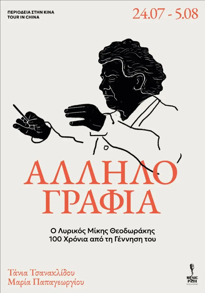 Το λυρικό έργο του Μίκη Θεοδωράκη, του σπουδαιότερου Έλληνα συνθέτη, όπως αποτυπώνεται στον δίσκο «Αλληλογραφία» της Μαρίας Παπαγεωργίου, πρόκειται να παρουσιαστεί για πρώτη φορά στην Κίνα. Η συναυλία θα πραγματοποιηθεί με τη συμμετοχή δύο σπουδαίων φωνών, που ο ίδιος ο συνθέτης είχε ξεχωρίσει: της Τάνιας Τσανακλίδου και της Μαρίας Παπαγεωργίου.