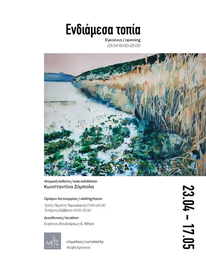 Στην έκθεση «Ενδιάμεσα Τοπία», η Κωνσταντίνα Ζόμπολα μάς προσκαλεί σε μια περιπλάνηση μέσα σε τοπία, που δεν ανήκουν ούτε στο απόλυτα πραγματικό ούτε στο αμιγώς φαντασιακό. Είναι χώροι που γεννά το βλέμμα, τόποι μεταβατικοί, όπου η μνήμη και η αίσθηση αλληλεπιδρούν, μεταμορφώνοντας την ύλη σε απόηχο του βιωμένου.