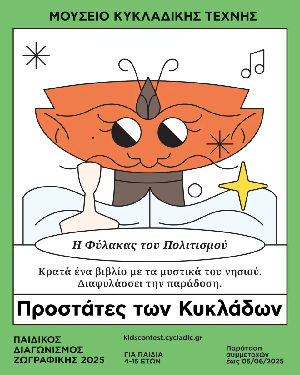 Ο διαγωνισμός ξεκίνησε στις 12 Μαρτίου και η υποβολή των έργων στο kidscontest.cycladic.gr/ θα ολοκληρωθεί στις 5 Ιουνίου του 2025. Τα έργα των παιδιών θα εκτεθούν στις 27 Σεπτεμβρίου στο Κέντρο Τεχνών του Δήμου Αθηναίων, στο πλαίσιο του 3ου Cycladic Kids Festival. Ο Παιδικός Διαγωνισμός Ζωγραφικής είναι μία από τις πιο επιτυχημένες δράσεις του Μουσείου Κυκλαδικής Τέχνης, προσελκύοντας τη συμμετοχή χιλιάδων παιδιών από την Ελλάδα και το εξωτερικό, καθώς επίσης και σχολεία ειδικής αγωγής και κέντρα υποδοχής και ένταξης προσφύγων.Φέτος, τα παιδιά καλούνται να φαντασθούν και να αποτυπώσουν τον «Προστάτη των Κυκλάδων», δίνοντάς του μοναδικά χαρακτηριστικά και ικανότητες που θα τον βοηθήσουν στην προστασία του φυσικού περιβάλλοντος των νησιών μας.