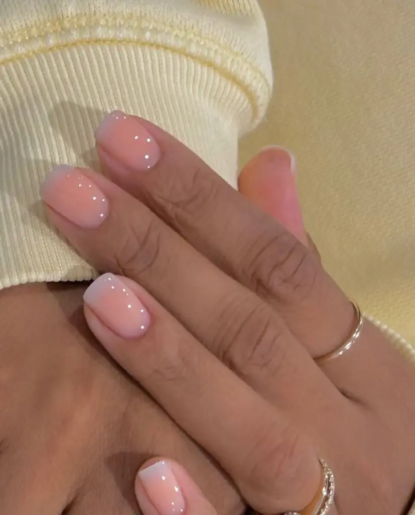 Το πρώτο βήμα είναι να προετοιμάσετε τη βάση των νυχιών, δημιουργώντας μια λεία, στρογγυλεμένη σιλουέτα (περισσότερο ή λιγότερο μακριά) και στη συνέχεια να λιμάρετε με ένα buffer και να ενυδατώσετε με έναν ορό κατάλληλο για την επανόρθωση των εύθραυστων νυχιών. Στη συνέχεια, εφαρμόζετε μια ενισχυτική βάση, αφήνετε να στεγνώσει και έτσι δημιουργείται η κλίση: η άκρη σκιαγραφείται με λευκό και στη συνέχεια εφαρμόζετε ένα λεπτό ροζ για να δημιουργηθεί ο τόνος.