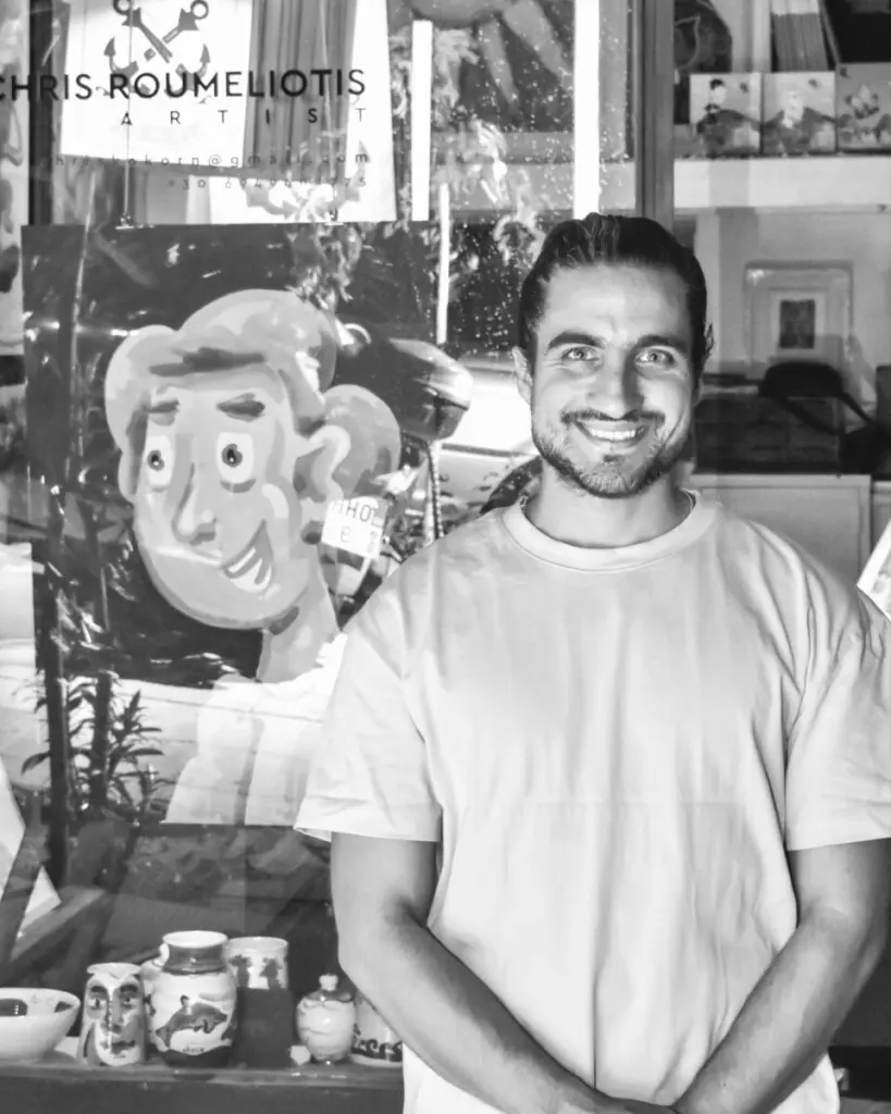 Τον Χρήστο Ρουμελιώτη, τον ανακάλυψα, και λέω ανακάλυψα καθώς κάθε φορά που πηγαίνω σε ένα Printed Athens ART Weekend στη Δημοτική Αγορά της Κυψέλης, η αγαπημένη μου στιγμή είναι ο ενθουσιασμός μπροστά από έναν πάγκο ενός καλλιτέχνη που θα προσθέσω την ίδια στιγμή στη λίστα μου στο Instagram, για να μην τον ξεχάσω μέχρι την επόμενη έκθεση. Γρήγορα είδα πως ζωγραφίζει και ζωντανεύει ήρωες και χρώματα σε σχολεία όλης της Ελλάδας, γεγονός που μου τράβηξε την προσοχή. Έχω μαθητές που συνηθίζουν να μου περιγράφουν το σχολείο τους και ποτέ δεν ξεχνούν να μου μιλήσουν για την τέχνη που τα περιβάλλει σε κάθε διάλειμμα και παιχνίδι. Και ξέρουν πάντα να μου περιγράψουν τις ζωγραφιές με τον μοναδικό και τρυφερό τρόπο που μόνο αυτοί ξέρουν κι εγώ τότε είναι που ελπίζω και αντιλαμβάνομαι το χάδι της δημόσιας τέχνης.