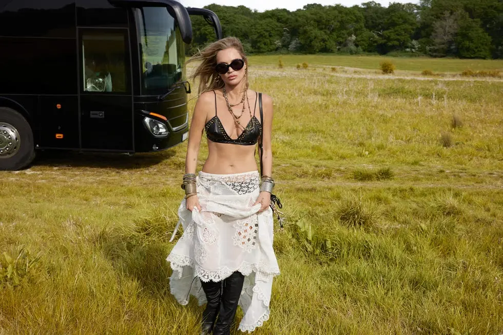 Η συλλογή, που κυκλοφόρησε σήμερα, 9 Ιουνίου, παρουσιάζει το supermodel να αξιοποιεί αυτό που ξέρει καλύτερα με μια έκδοση εμπνευσμένη από φεστιβάλ, ιδανική για την ερχόμενη σεζόν. Η συλλογή συνδυάζει μποέμ επιρροές με το χαρακτηριστικό ροκ εν ρολ στυλ της Moss, με αποτέλεσμα μια σειρά από νοσταλγικά σχέδια βγαλμένα κατευθείαν από τη σκηνή των πάρτι του Λονδίνου των 2000.