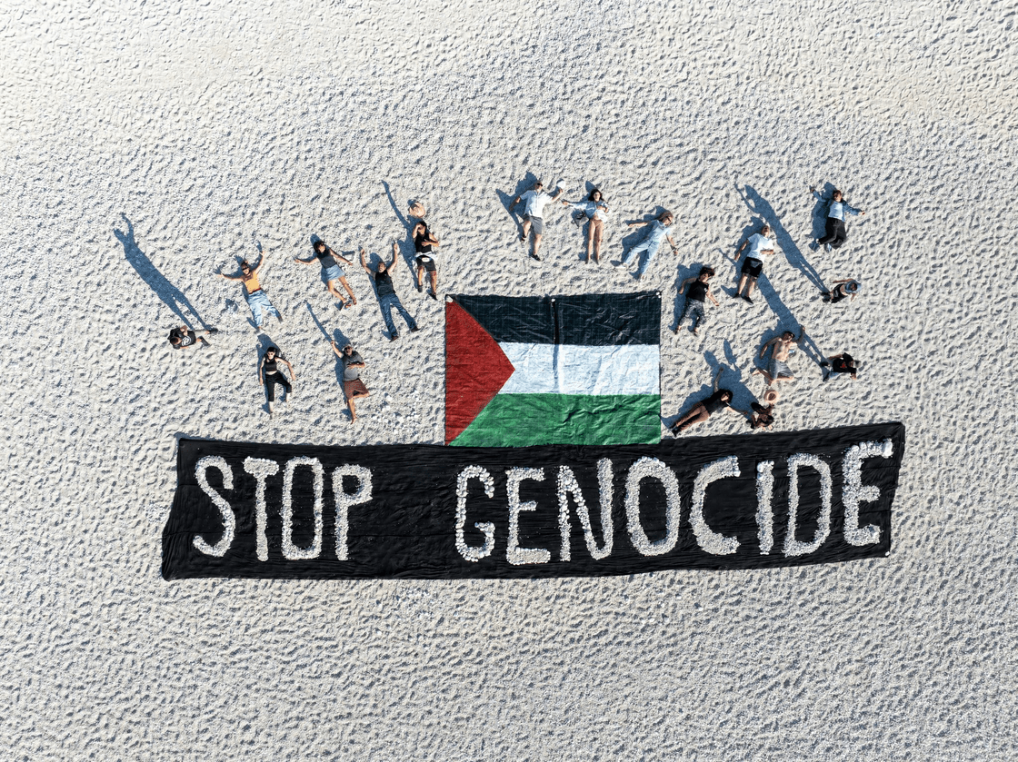 Ξαπλωμένοι κατά μήκος του πανό με το σύνθημα κα της μεγάλης παλαιστινιακής σημαίας, οι συμμετέχοντες στη δήλωση υπέρ του παλαιστινιακού λαού που αποδεκατίζεται από τα ισραηλινά πυρά καθημερινά, στη λωρίδα της Γάζας. Τα στιγμιότυπα δημοσιεύθηκαν στα μέσα κοινωνικής δικτύωσης.