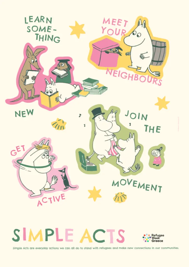Σηματοδοτώντας τα 80 χρόνια από την έκδοση του βιβλίου «Τα Moomins και ο μεγάλος κατακλυσμός (1945)» της Φινλανδής καλλιτέχνιδας και συγγραφέα Tove Jansson, το Refugee Week συνεργάζεται με τους χαρακτήρες Moomin σε μια σειρά δραστηριοτήτων.