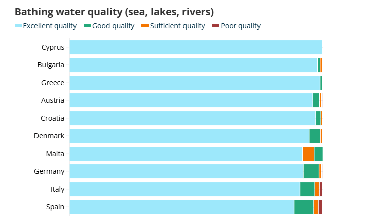 Η πιο πρόσφατη ανάλυση του Ευρωπαϊκού Οργανισμού Περιβάλλοντος (EEA), η οποία εξέτασε 22.127 παράκτια, λιμναία και ποτάμια σημεία, κατέταξε το 85% των περιοχών ως «εξαιρετικής ποιότητας».