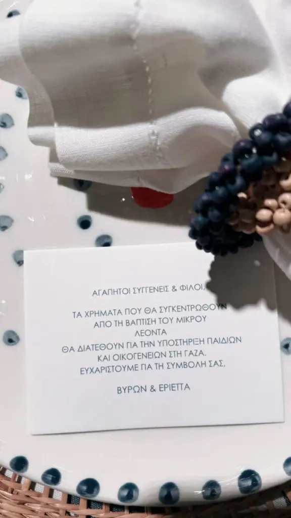 Ιδιαίτερη σημασία είχε και η κίνηση του ζευγαριού να διαθέσει τα χρήματα που συγκεντρώθηκαν για τον μικρό Λέοντα σε ανθρωπιστική βοήθεια για τη Γάζα, όπως ανακοίνωσε η ίδια η Εριέττα Κούρκουλου.