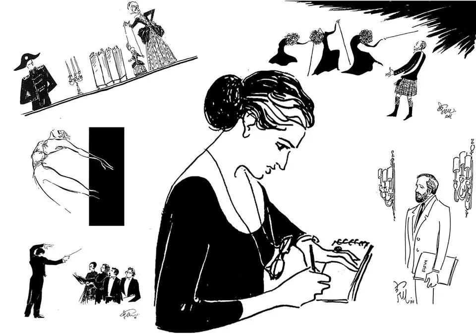 Συνεργάστηκε συχνά ως σκηνογράφος – ενδυματολόγος με την Εθνική Λυρική Σκηνή, και ως μουσικός επιμελητής με το Εθνικό Θέατρο και άλλα Αθηναϊκά Θέατρα. Από το 1961 αποτυπώνει με τα σκίτσα της τα καλλιτεχνικά δρώμενα της Αθήνας στις στήλες της θεατρικής, μουσικής και χορευτικής κριτικής στην εφημερίδα ΜΕΣΗΜΒΡΙΝΗ και το περιοδικό ΕΙΚΟΝΕΣ της Ελένης Βλάχου. Από το 1974 έως και το 2011 συνέχισε στην εφημερίδα ΚΑΘΗΜΕΡΙΝΗ, κλείνοντας έτσι συνολικά 50 χρόνια αποτύπωσης της πολιτιστικής κίνησης της Αθήνας με τα αναγνωρίσιμα πλέον σκίτσα της.