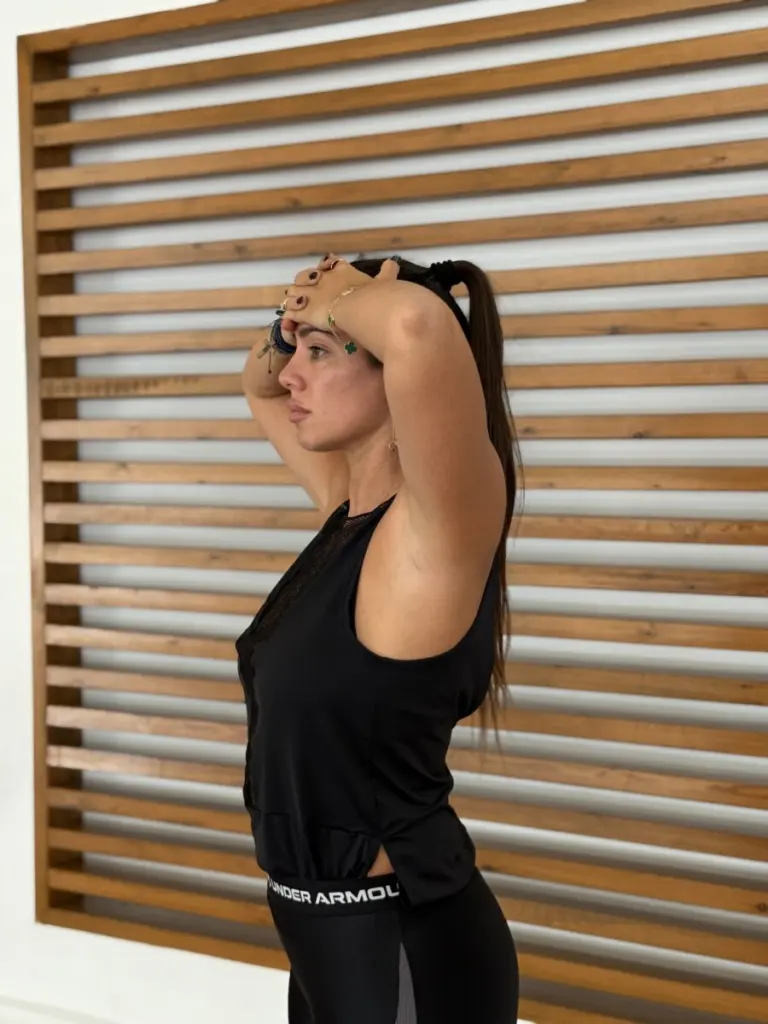 Δένουμε τα δάχτυλα πίσω από το κεφάλι. Κατά την εκπνοή πιέζουμε ελαφρώς το κεφάλι προς τα πίσω πάνω στα χέρια, χωρίς να κουνιέται ο κορμός.