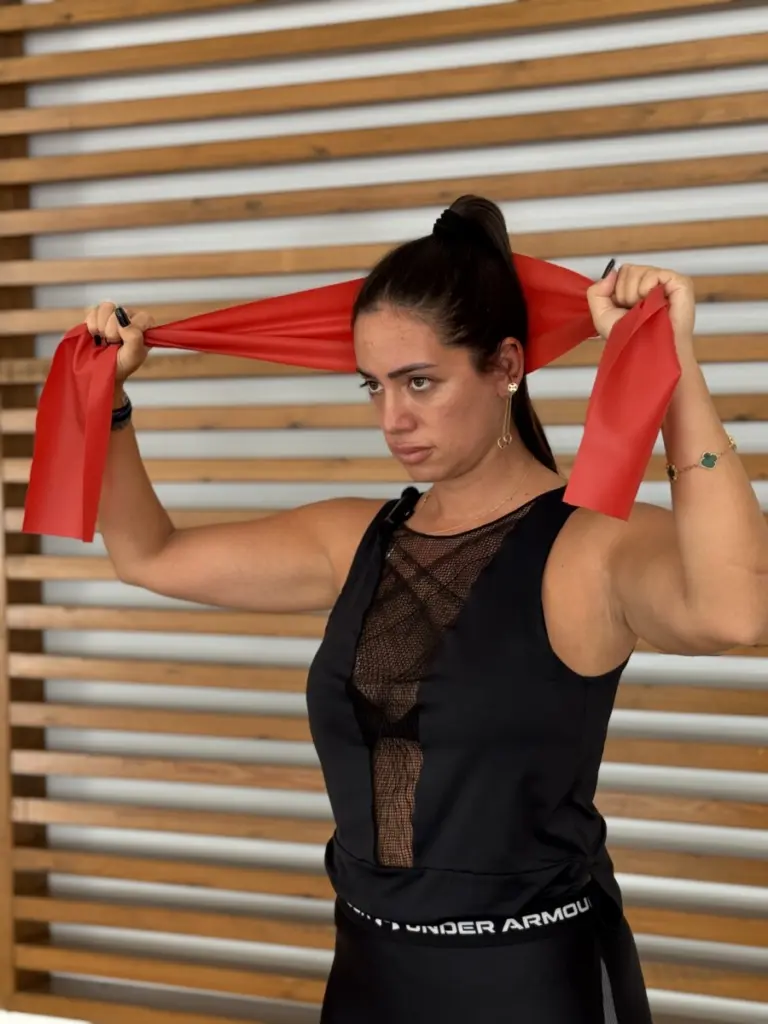 Τοποθετούμε το λάστιχο στο πίσω μέρος του κεφαλιού και κρατάμε σταθερά τα άκρα του μπροστά. Με την εκπνοή φέρνουμε το κεφάλι προς τα πίσω δημιουργώντας ήπια αντίσταση.