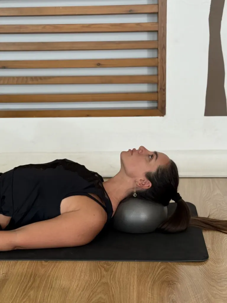 Ξαπλώνουμε ανάσκελα και τοποθετούμε μια μικρή μπάλα pilates κάτω από τον αυχένα. Με την εκπνοή κοιτάμε προς τα πάνω και πιέζουμε ελαφρώς την μπάλα με το κεφάλι.
