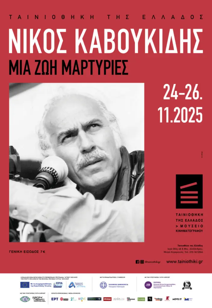 Η τελετή έναρξης του αφιερώματος στον Νίκο Καβουκίδη θα πραγματοποιηθεί τη Δευτέρα 24 Νοεμβρίου 2025, στις 20:00, στην Ταινιοθήκη της Ελλάδος. Στις 20:30, θα προβληθεί η ταινία Μαρτυρίες (1975, 102′) παρουσία του σκηνοθέτη.
